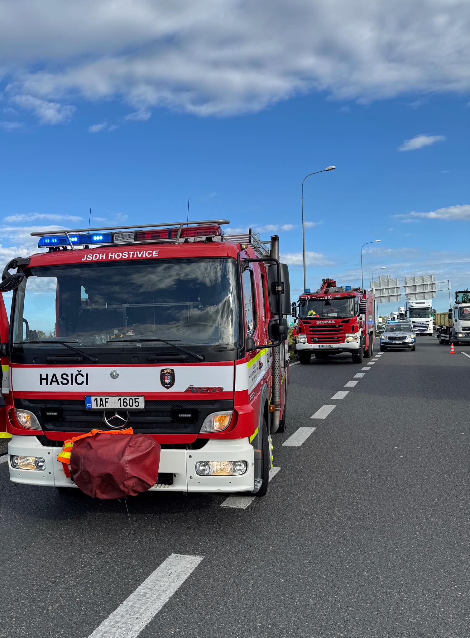 22. Dne 22. 4. 2025 byl JSDH Hostivice vyhlášen poplach – dopravní nehoda 3 osobních vozidel. Jednotka vyjížděla s CAS 20 Mercedes Benz – Atego v počtu 1+3 členů. Po příjezdu na místo bylo zjištěno, že se jedná o nehodu 8 vozidel a na místě je již ZZS. Jednotka na místě provedla protipožární ochranu, uzavření jízdního pruhu pomoci CAS a kuželů, zasypání úniků provozních kapalin, měření baterie el. vozidla pomocí termokamery a zajištění tepelného komfortu účastníkům nehody. Na místě společně s HZS Letiště Praha, HZS Kladno, HZS Praha.